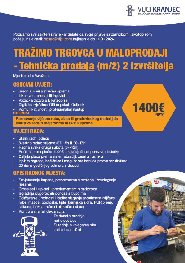 Trgovac će biti zadužen za prodaju našeg širokog asortimana spojne i pričvrsne tehnike, ljepila, brtvila, pur pjena i alata.